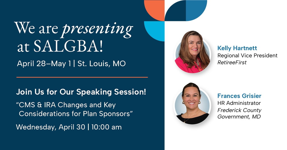 Join Kelly Hartnett (VP, Client Relations at RetireeFirst) and Frances Grisier (HR Administrator, Frederick County Government, MD) for the session CMS & IRA Changes and Key Considerations for Plan Sponsors, on April 30, 2025 10:00 AM.